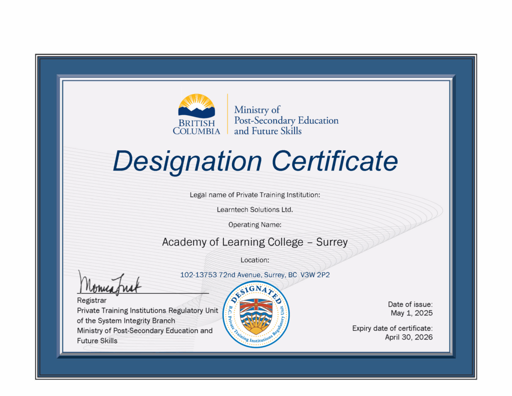 EVERY PROGRAM OFFERED AT ACADEMY OF LEARNING SURREY IS DESIGNED TO PREPARE STUDENTS FOR THE DEMANDS OF TODAY'S PROFESSIONAL WORKPLACE.